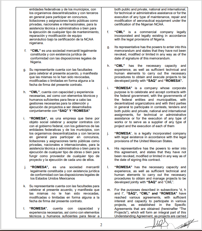 We are thrilled to announce an exciting collaboration agreement, formally known as a *Memorandum of Understanding (MOU), between **SERVICIOS AERONAUTICOS QUINTANA, S.A. (SAQ), **Craftsmen Maintenance Limited (CML), and **ROMESA BUSINESS & TRADING SOLUTIONS (ROMESA)*. This partnership aims to enhance aviation services and project development on a global scale.